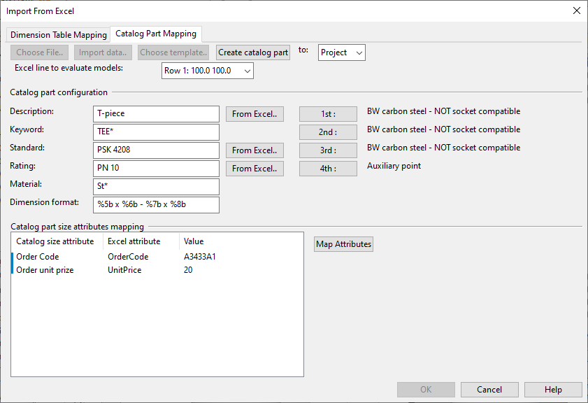 On the Catalog Part Mapping tab, you can define the catalog part to be created and map imported attributes to part size attributes.