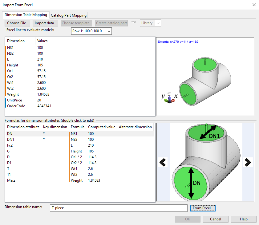 On the Dimension Table Mapping tab, you can import the part's dimensions from the Excel file and map imported dimensions to dimension table attributes.