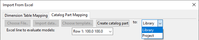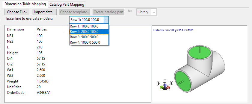The Import from Excel tool allows an administrator to create a new catalog part and define its dimension table by importing the dimension data from a Microsoft Excel file. This is useful, for example, when there are many different sizes of the part, and, instead of adding each size manually, you can simply import all dimension variations from a data sheet. The preview function allows you to review the data before adding it to the library or the project database.