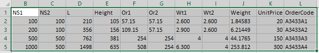 Select the data to import by selecting consecutive header and value cells from the Excel file. The selection should include the required dimension data and also any required part size specific data such as ordering information.