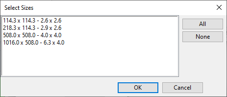 Select which of the sizes defined in the dimension table to include in the catalog part, and click OK.