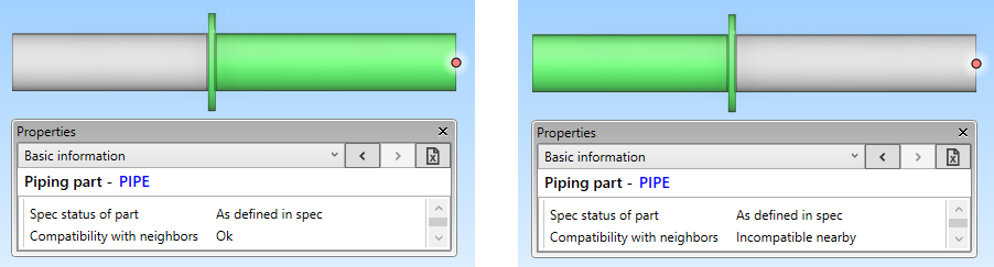 In the 3D model, you can use the Basic information tab of the Properties pane to check whether a given piping part is compatible with its current neighbors.