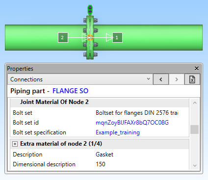 If you are on the Connections tab and the Messages pane is open, you can see possible errors and warnings that the program might issue in regard to the flange joint. For example, if the flanged connection requires a bolt owner and it has not been set yet, the message pane displays a message such as "Warning: Specification 'DIN_H2A' and 'Example_training' are using different bolt sets".