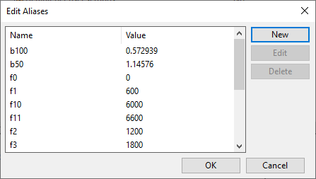 Browse to [project] > Configuration > Plant Modeller and double-click the Aliases configuration object. The Edit Aliases dialog opens, listing the currently defined aliases.