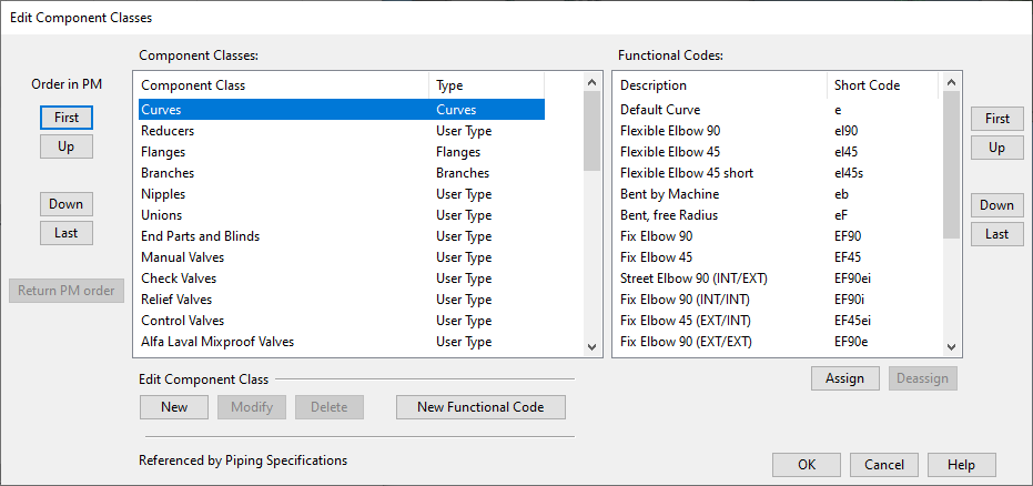 Component class defines the general function of the component ("Curves", "Branches", "Transitions", and so on) and each of these classes can contain several functional codes that define how the component or method can be implemented in practice in the given project. For example, to implement the various curves in a pipeline, the functional codes for "Curves" can define that the curves can be implemented using fixed-angle elbows or machine-bending, and that the elbows can be butt-welded or socket-welded.