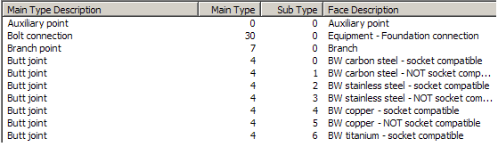 At each connection point of a part the connection face is given a two-character code. The first character defines the primary type of the face, and the second character defines the subtype. Primary connection types are defined by the system as shown in table below and their meaning cannot be changed. In this documentation the primary type is referred to by its symbolic name. Codes for the subtype are [0.200] --> 201 different subtypes are supported.