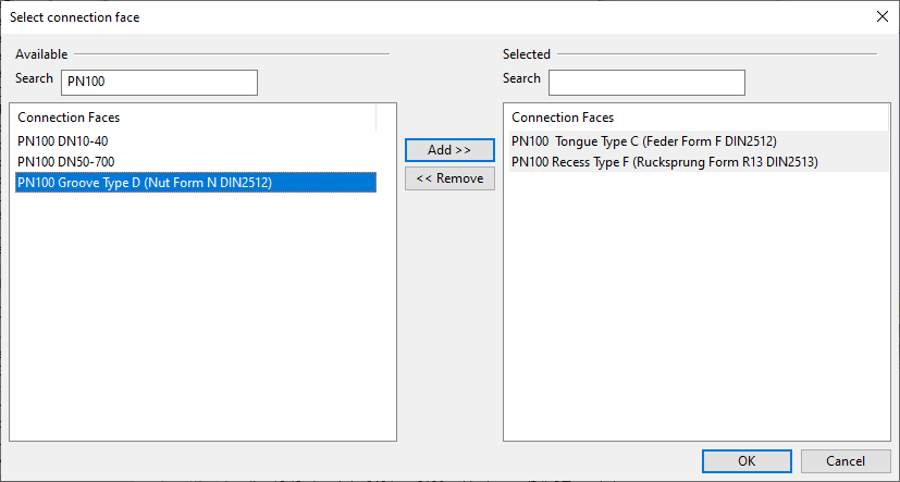 Click Add. The Select connection face dialog opens, listing all possible connection face types.
