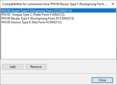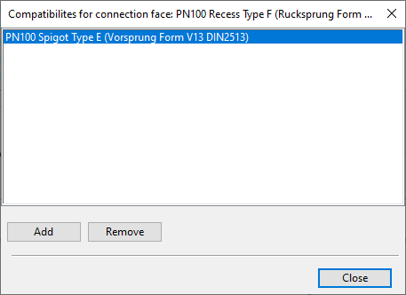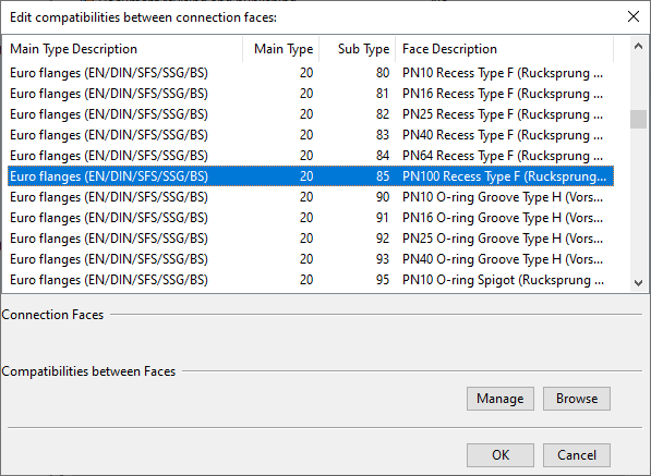 Select the connection face you want to manage and click Manage. A list of currently defined compatibilities opens.