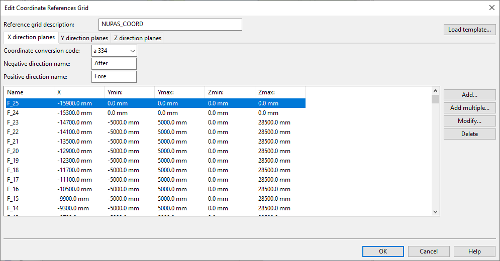 In the Edit Coordinate References Grid dialog, the Add multiple button opens the settings for generating multiple reference planes with different X/Y/Z coordinate values and same min–max values. The coordinate value for each plane is incremented by a fixed value. If an ID number is used as part of the plane name, then also the ID number is incremented by one for each new plane.