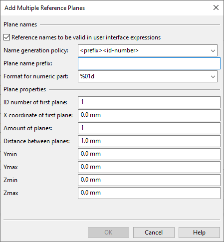 Plane name prefix – Specify the prefix string for generating the plane names. The prefix cannot contain semicolons. When Reference names to be valid… is enabled, the name has additional restrictions regarding valid characters, otherwise the only restriction is that the name cannot contain semicolons or /* comments */.