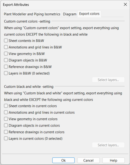 In the Export Attributes dialog, you can select which entities should ignore the overall color scheme when a document or diagram is exported using the Custom current colors or Custom black & white option of the export format. This enables, for example, the sheet and the annotations to be exported in black and white while everything else is exported in their current colors.