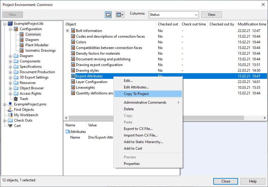 1. In the Project Environment dialog, in [library] > Configuration > Common, right-click the Export Attributes configuration object and select Edit. The Export Attributes dialog opens.