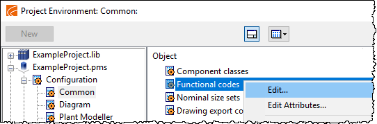 To access the Edit Functional Codes dialog, open the Project Environment dialog, browse to [project] > Configuration > Common, and then either double-click the Functional codes configuration object or right-click it and select Edit from the context menu.