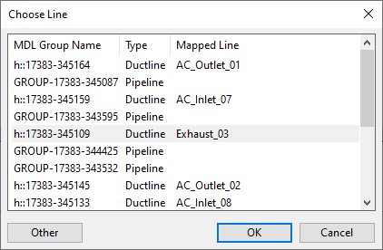 Map – Normally, this opens a dialog for selecting which CADMATIC entity to use in the selected mapping. If the MDL data lists several lines for a single part, the Choose Line dialog opens, and you can either map the part to a specific CADMATIC line by selecting the line from the list and clicking OK, or you can click Other to choose an out-of-spec component.