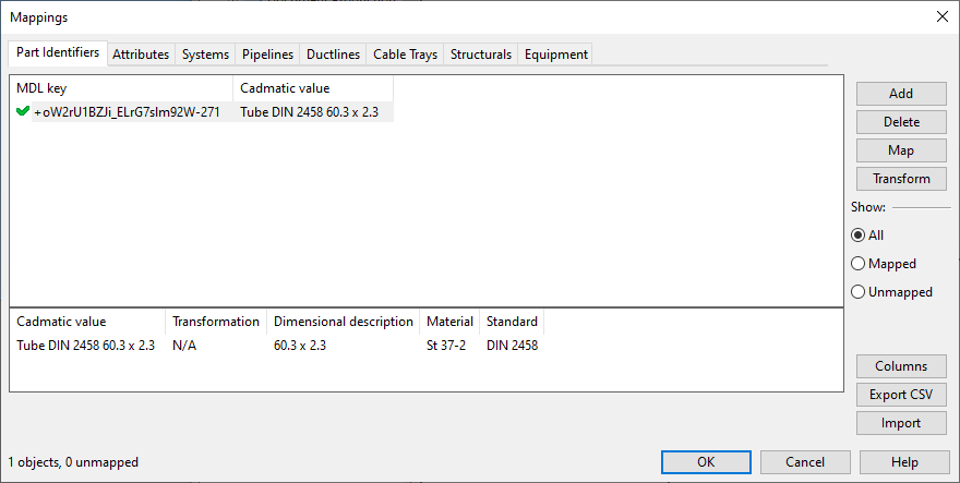 Define the relevant mappings on these tabs: Part Identifiers, Attributes, Systems, Pipelines, Ductlines, Cable Trays, Structurals and Equipment.