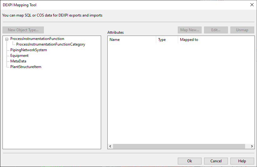 3. Enter a name and define any other attributes that the mapping configuration object is to have, and click OK. The DEXPI Mapping Tool dialog opens.