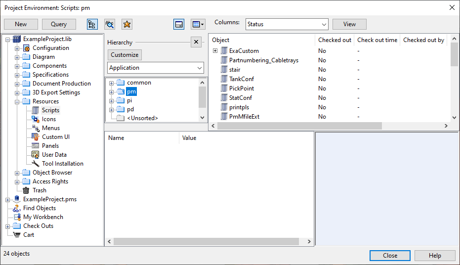 In the Project Environment dialog, in the Resources > Scripts view of the library or project database, there are some predefined scripts that are used for running the CADMATIC design applications, and administrator can also add custom scripts there.