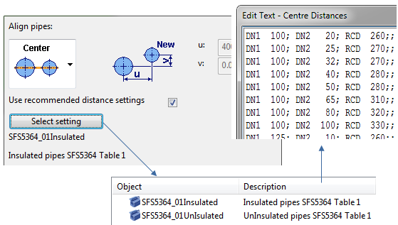 In [project] > Specifications > Construction > Follow Pipe Settings, project administrators can define recommended distance values that the Follow pipe tool can use to route a pipe at a given distance from another, existing pipe.