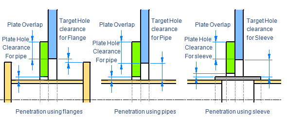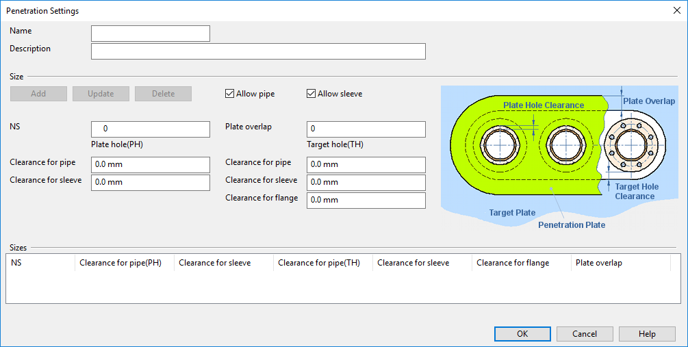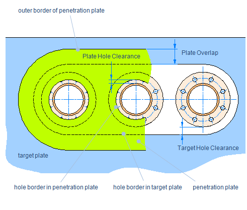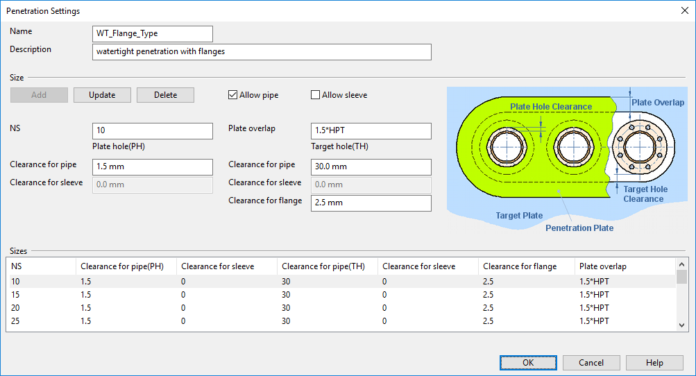 Penetration settings define what kind of clearance values to use when the penetrating pipe has a certain Nominal Size, and how much overlap there is between the 'target plate' (hull plate) that is being penetrated and the 'penetration plate' that is added onto the target plate to make the penetration watertight.