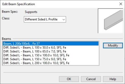A beam specification defines what kind of beams can be used in a given task. You can define a separate specification for the beams used in supports, another for the beams used in platforms, and so on. Beam specifications are used in inserting beams (Insert), also in the Support Designer (Supports).