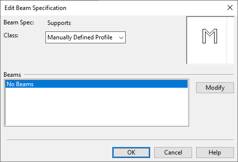 Make sure all the required beam classes and beam sizes are listed in Edit Beam Specification, and click OK to accept the specification.