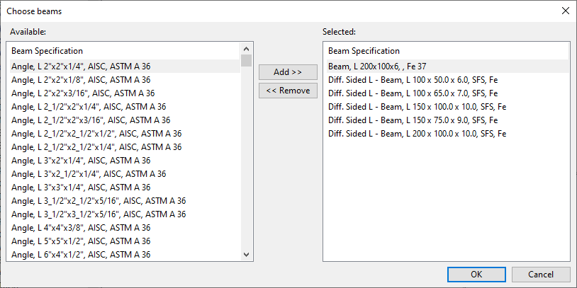 The left pane lists the beam sizes that are available in this class, and the right pane lists the ones that are currently selected to the specification.