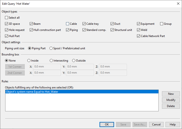 In this example, we have selected to include all object types and defined a test that checks whether object's System name is "Hot_Water":