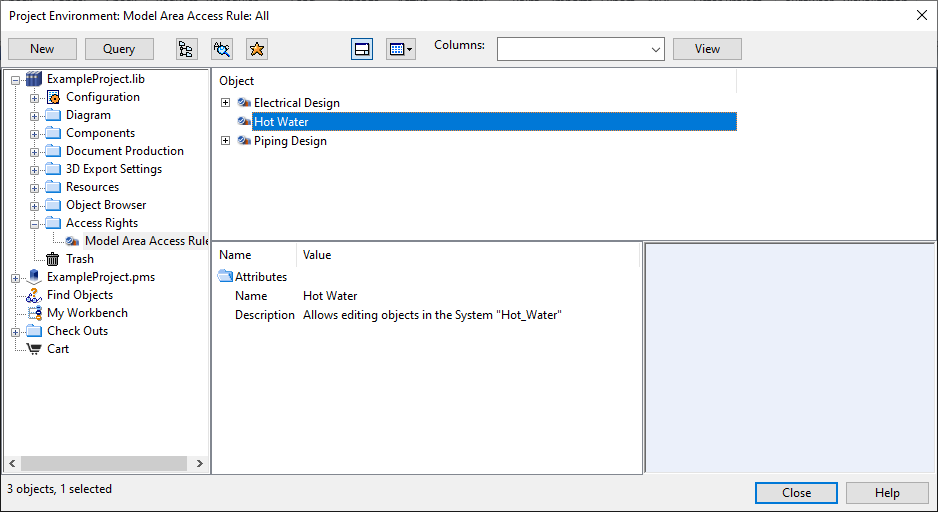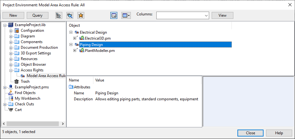 In the Project Environment dialog, in the Access Rights > Model Area Access Rule view of the library or project database, you can define access rules for Plant Modeller.