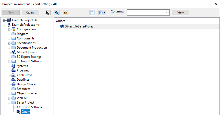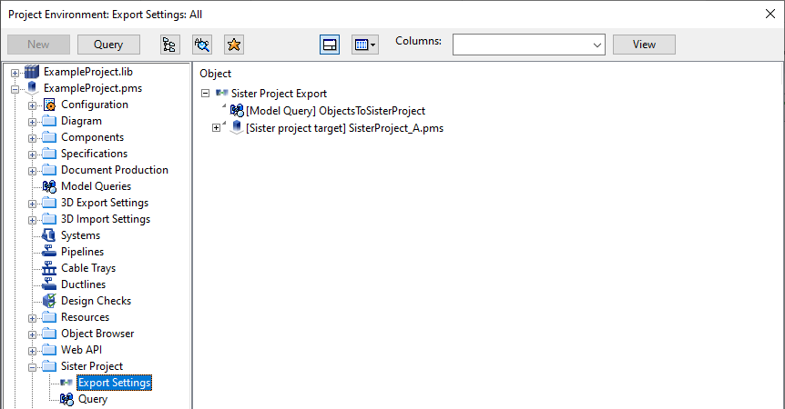 In the Project Environment dialog, [project] > Sister Project > Query allows you to define model queries for sister project export. The model query defines which objects are included when exporting data from the source project to the target project. Also dependent objects that the query does not specifically select are exported, as described in Sister project model query and dependent objects.