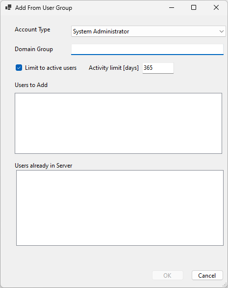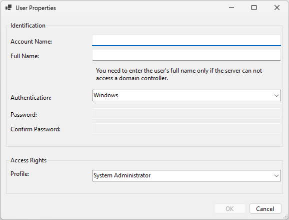 Enter the full name of the new user. This is the name that will be visible to other users of the applications. You can use either the "Firstname Lastname" or "Lastname Firstname" format, as you prefer. Tip: If using Windows authentication, leaving this field empty will retrieve the full name from the domain controller. This also serves as a confirmation that the account name has been entered correctly. |