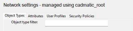 On the Network settings pane, select the Object Types tab to manage the attribute assignments and security settings of object types in the selected COS network. The list can be filtered by entering a text string into the Object type filter field.
