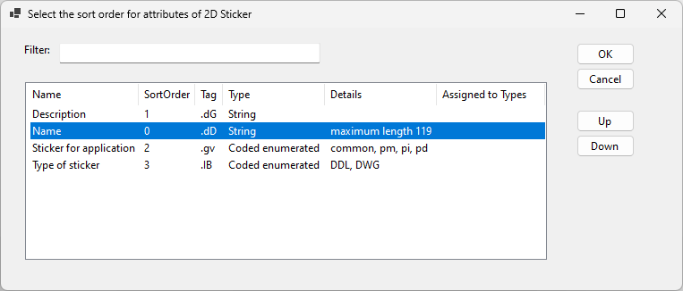 Opens the Select the sort order for attributes of… dialog for adjusting the order in which the attributes are presented. Select an attribute and click Up or Down to change its SortOrder value; the smaller the value, the higher the attribute is in user interfaces that list the attributes. |