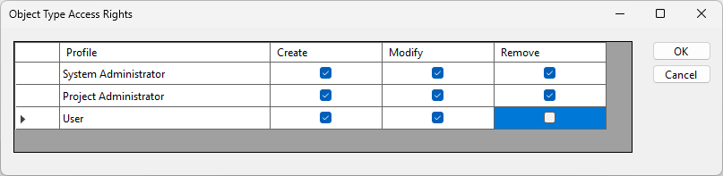 Opens the Object Type Access Rights dialog for selecting which User Profiles are allowed to Create, Modify, and Remove objects of this type. Certain application functions require that also users can write to certain project objects. Otherwise, there is no great risk in limiting the access rights—you can easily restore the original rights if needed. For example, limiting the access rights of library objects such as GDLs will not affect the functionality of the program, it will only affect the users who can no longer modify those objects. Note: You cannot restrict access to specific object subtypes, such as model objects that represent air ducts. |