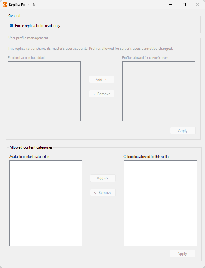 Opens the Replica Properties dialog which shows information about the selected replica server. General Select this option to try to force the replica server into read-only mode. This requires that the replica server is using online replication. If the replica server is using offline replication and there is an attempt to update the master server with an update file received from the replica server, an error message indicates that the update cannot be performed. If the replica server manages its own user accounts, here you can designate which ones are allowed on this server. Click Apply to apply the changes. (This is future functionality.) |