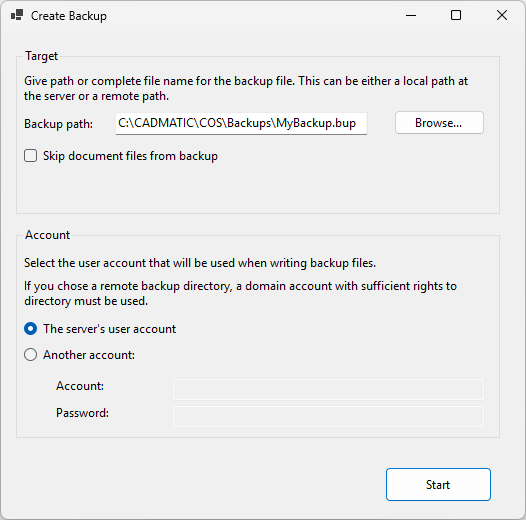 Select this option to use the COS server's user account for creating the backups. This is the user account that you used to Connect to the server. Note: If the backup path points to a remote folder, this must be a domain account that has the required privileges on the target computer. |