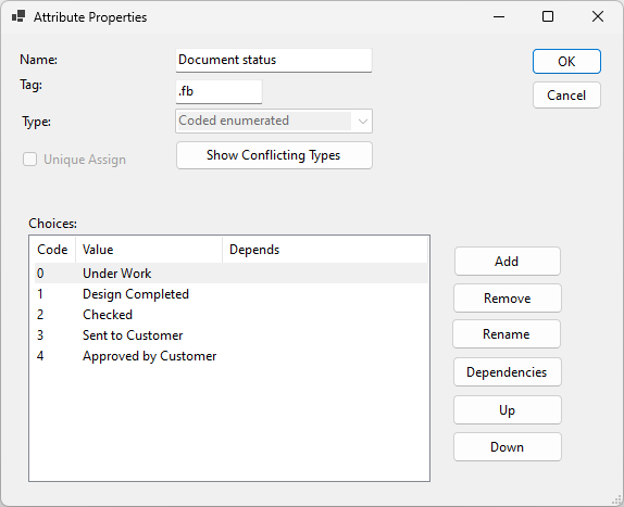 There are a number of predefined attributes, and you can also create new ones. Attributes can be assigned to object types on the Object Types tab. An attribute's configuration specifies whether the attribute can be assigned to multiple object types or only to a single object type at a time.