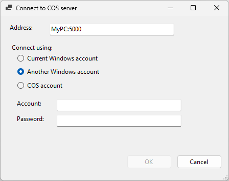 When you establish a connection to a COS server using either a Windows or COS account, the connection information is saved in a local credential manager, influencing your future log-ins. If you wish to change your login method for a particular server, you will need to remove the existing connection and then reconnect using different credentials.