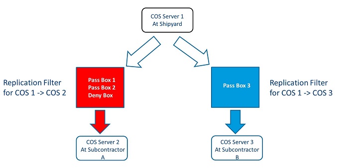 The shipyard defines two filtered replicas for the main COS server at the shipyard: one for A and one for B. Replica A will have two pass boxes (the boxes with red dashed lines) and one deny box (the yellow box with black dashed lines). Replica B will have one pass box (the box with blue dashed lines).
