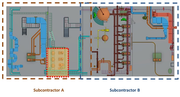 The intent is to use two subcontractors, A and B, for the detail design as shown in the picture below. Neither of them should be able to see the full model. The secret space can only be visible at the master site, but subcontractor A must be able to do detail design documents in the area that encloses the secret space. The pass boxes of the subcontractors overlap so that they can share the common design interface to connect a pipeline from A to B, and so on.