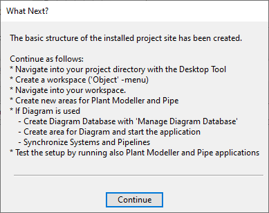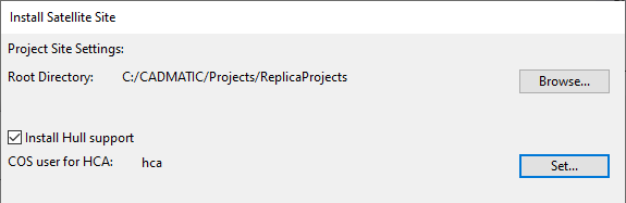Perform the following to install a satellite site on a replica COS server. This creates the basic project structure in the file system, and then it is possible to use the CADMATIC desktop to create a designer's workspace and application areas.