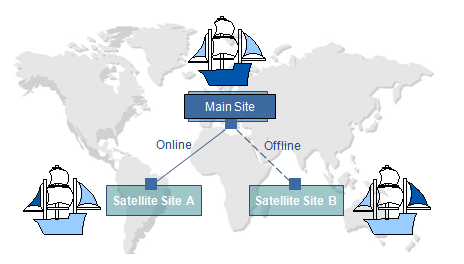 In the picture below, Satellite Site A has an online connection to the main site while Satellite Site B is in offline mode.