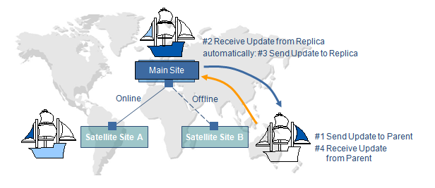 Satellite Site B cannot see the work that has been done at Site A or Main Site and those two sites have no knowledge of the current situation at Site B. To get everybody up-to-date, Site B sends an update to Main Site and Main Site sends an update back to Site B.