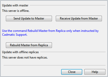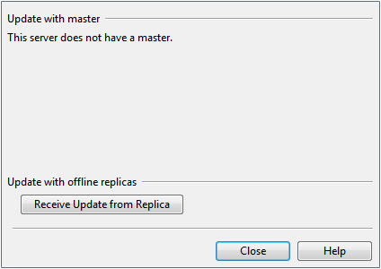 The update procedure is always initiated by the replica server; you cannot send an update from the master server without first having an update file from the replica. If update files are lost, they can be recreated. See Recovering a project.