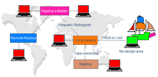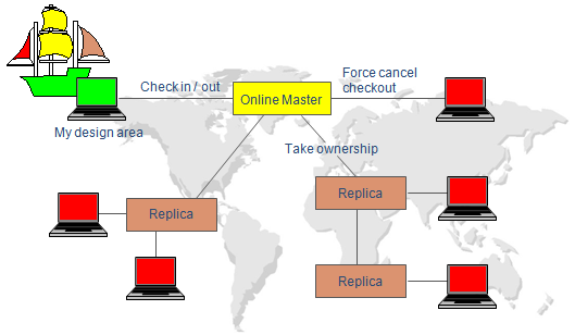 Design area connected to a replica server can never see yellow, because objects owned by the local replica are orange.