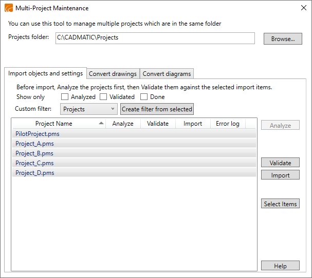 In the CADMATIC desktop, the Multi-Project Maintenance tool allows the project administrator to perform the following tasks: