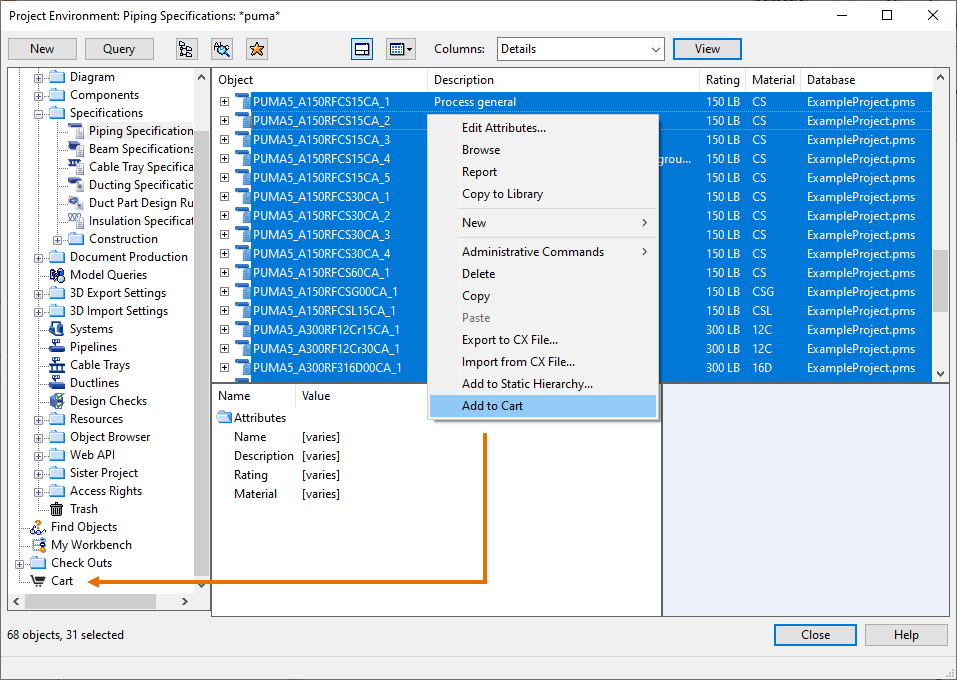 In the Project Environment dialog of the pilot project, use the Cart function to collect the required objects from the library.