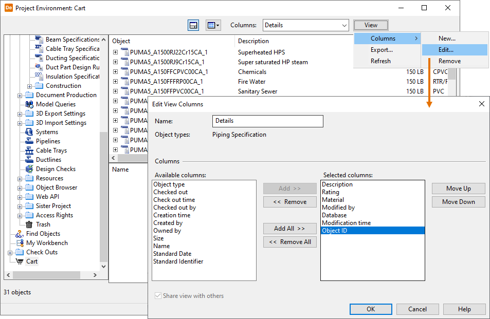 In the Cart view, select View > Columns > Edit and add the Object ID column to the view. This allows the object IDs to be included in the tag records file—if they are missing, the validation performed in the Multi-Project Maintenance dialog will fail.