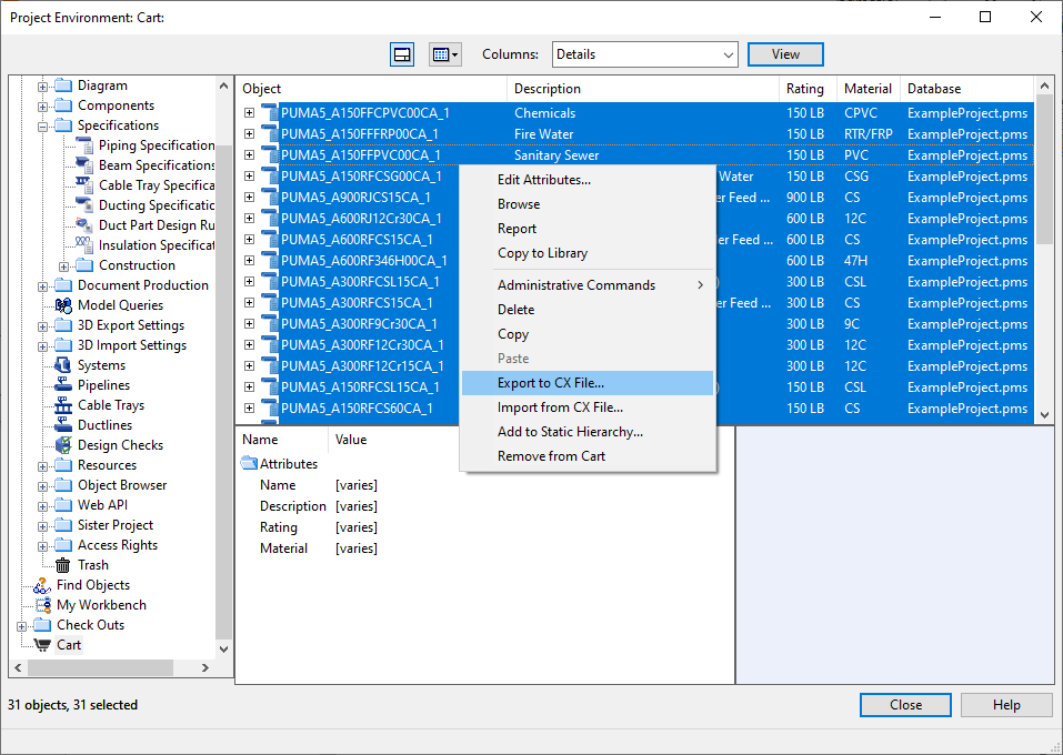 Note: Only one .cx file is to be created at this point! Do not close the Project Environment dialog until you have added all the needed objects to the cart and performed the export. The cart only holds its objects as long as the Project Environment dialog remains open; closing and re-opening the dialog will empty the cart. You can remove objects from the cart manually, if needed.