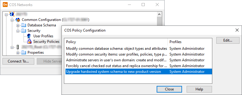 In the CADMATIC 2025H2 desktop, select Object > Manage COS, open the Common Configuration > Security > Security Policies configuration, set the COS security policy to allow your user account to upgrade the hardwired system schema, and then close the COS configuration dialogs.