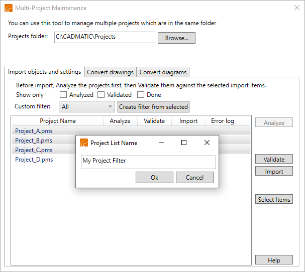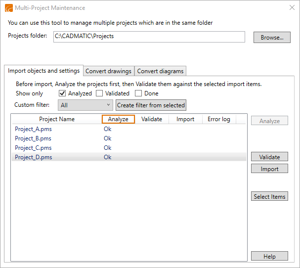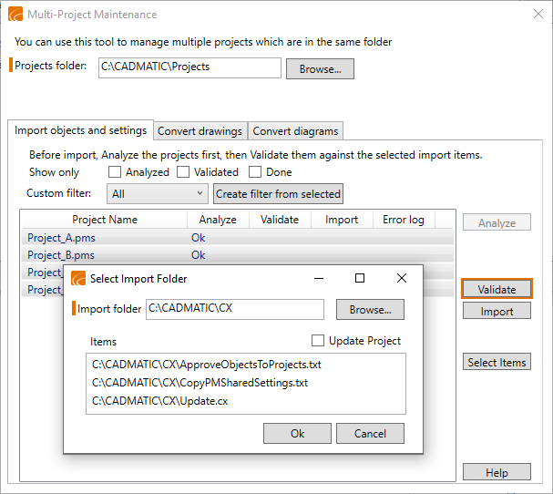 Click Ok. When the validation process is completed, the Validate column shows whether each project is "Ok" or "Failed".
